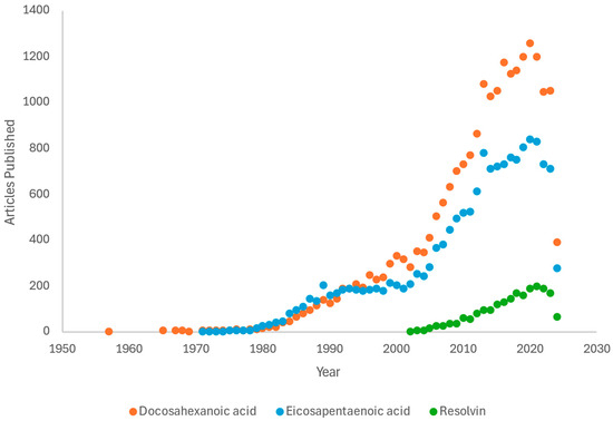 An online search using PubMed for published articles whose titles contain either docosahexaenoic acid, eicosapentaenoic acid, or resolvin based on the year published, showing the increase in published research since the 1980s. Due to other chemicals using similar abbreviations, search terms were restricted to full names only. Data correct as of May 2024.