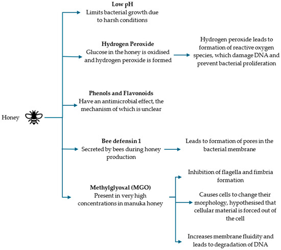 Summary of the ways in which the different components of honey are thought to exhibit antimicrobial effects on bacteria [73,77,78,79,80,81].