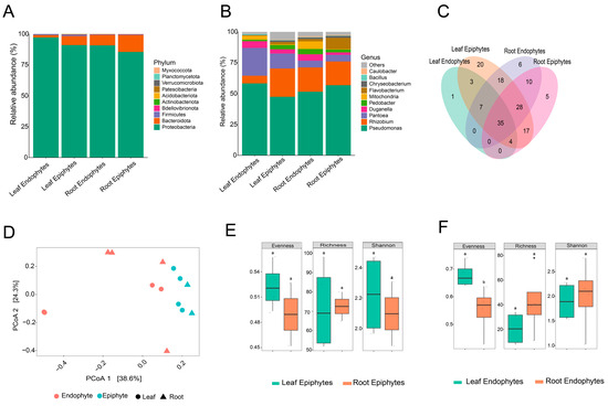 Statistical analyses were performed with the vegan package [22] in R (v.4.3.1). Paired Kruskal-Wallis test was used to test for differences in sample alpha diversities (observed OTUs and Shannon, Evenness indices). Taxabarplots and Venn diagram were generated using the R package “microeco” (v.1.7.1) [23]. The PCoA analysis based on Bray-Curtis and Jaccard distance was performed to determine and visualize dissimilarity in bacterial communities among plant organs (roots and leaves) and plant habitat (i.e., epiphytes and endophytes). The analysis of variance (ANOVA) was carried out using distance matrices (Adonis) with 999 permutations to determine significant differences in the bacterial community composition among habitats.