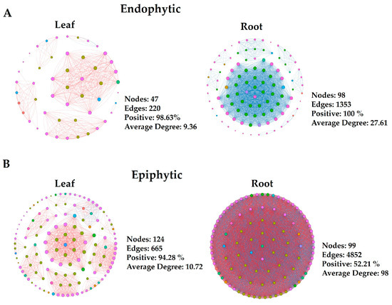 Four groups each for endophytic (A) and epiphytic networks (B) are illustrated. Individual types of networks within each category are indicated. With the node size proportional to node connectivity, the node color represents various phyla, while the line color indicates positive (red) and negative (blue) correlation coefficients. Network construction employed Spearman’s correlation coefficient, with r > 0.6 and p < 0.05 as criteria.