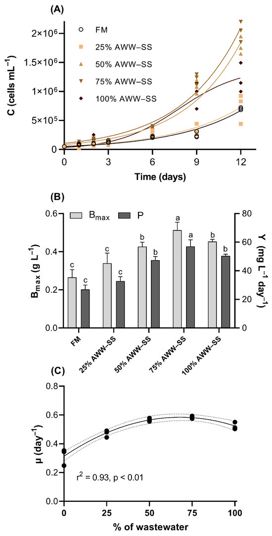 Logistic growth curves (A), maximum biomass reached and yield (B), and specific growth rates (C) of Durusdinum glynnii cultivated in different proportions of wastewater from shrimp culture in a synbiotic system. µ—specific growth rate (day−1), Bmax—maximum biomass reached (g L−1), Y—daily biomass productivity (mg L−1 day−1). Pointed lines represent 95% of confidence interval. Different letters indicate significant differences (p < 0.05) between treatments by Tukey’s post hoc test.