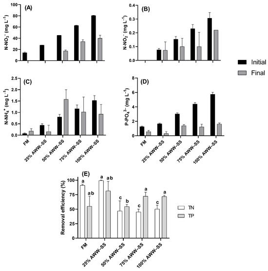 The different AWW–SS proportions evaluated in the present study resulted in different initial concentrations of N–NH4+, N–NO2−, N–NO3−, and P–PO43− (Figure 2). N–NO3− was completely absorbed in the control and the 25%–AWW–SS, while for N–NO2−, low or no absorption was observed. In the 50% AWW–SS, the initial level of N–NH4+ was considerably higher than the final level. A high phosphorus uptake was observed in all treatments.