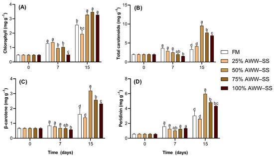 Overall, lower oscillation in pigment content was found at day 7 compared to day 15. At day 15, higher levels of chlorophyll were measured in cells grown on 50% AWW–SS compared to the 25% AWW–SS treatment and the control (Figure 3A). Similarly, high content of total carotenoids, β-carotene, and peridinin were found in cells grown at 50% AWW–SS at the end of the cultivation period (Figure 3B–D).