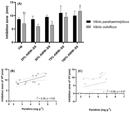 Inhibition zone (A) of extracts from Durusdinium glynnii biomass and regressions (B,C) with peridinin against Vibrio parahaemolyticus and V. vulnificus bacteria strains. VP—Vibrio parahaemolyticus; VV—Vibrio vulnificus. Pointed lines represent 95% of confidence interval. Different letters indicate significant differences (p < 0.05) between treatments by Tukey’s post hoc test.