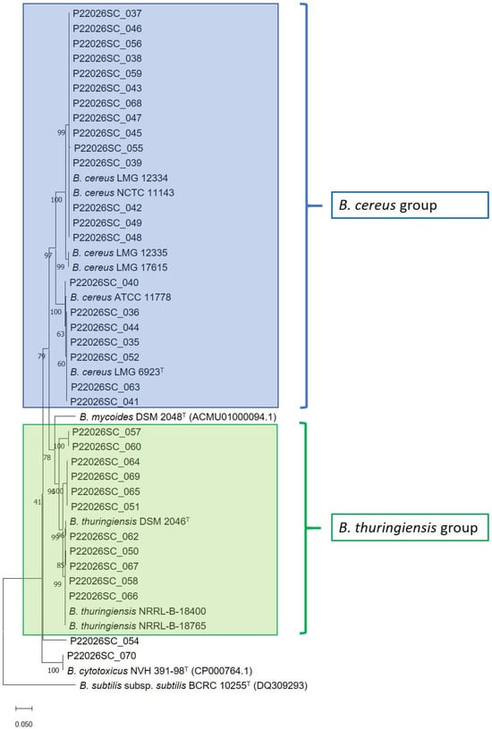 The Sanger sequences of the gyrB gene were aligned with Clustal X software v2.0 [25], obtaining a final consensus length of 645 nucleotides for the 44 strains under analysis and the type strain of the species B. mycoides DSM 2048T and B. cytotoxicus NVH 391-98T, for which the sequence was retrieved from the NCBI database. The consensus-sequence alignment was imported on MEGA software version 11 [26], and the Neighbor-Joining algorithm was used for the reconstruction of the phylogenetic tree. The evolutionary distances were computed using the Tamura–Nei model with complete deletion. The gyrB sequences of the strain B. subtilis subsp. subtilis BCRC 10255T was retrieved from the NCBI database and used as the outgroup.