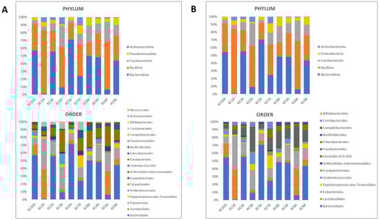 The two pipelines identified the presence of five different phyla among the samples analyzed, where the most abundant were Bacteroidota (former Bacteroidetes [34]) and Bacillota (former Firmicutes [34]). This is consistent with previous reports [35], which characterized the microbiota of 96 healthy dogs. Bacteroidetes and Firmicutes, together with Fusobacterium, represent the most important bacterial phyla in the gastrointestinal tract of dogs [36]. In particular, it is widely accepted that the Firmicutes/Bacteroidetes (F/B) ratio has an important role in maintaining intestinal homeostasis [37,38] and the evidence of this study is in accordance with that reported by Chaitman et al. (2020) [39], where the authors observed a significantly lower abundance of Bacteroidetes in dogs affected by acute diarrhea.