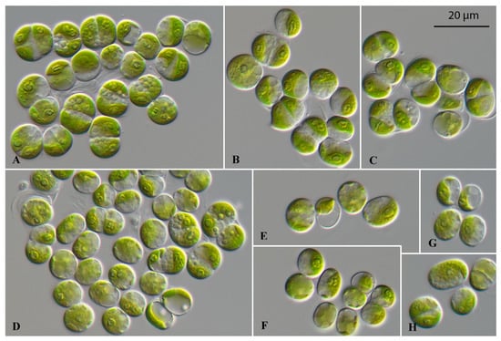 Morphology and phenotypic plasticity of Ulosarcina terrestrica (SAG 2661) grown on 3N-BBM + V medium. (A–H) Different sarcinoid and coccoid stages. Scale bar = 20 µm.