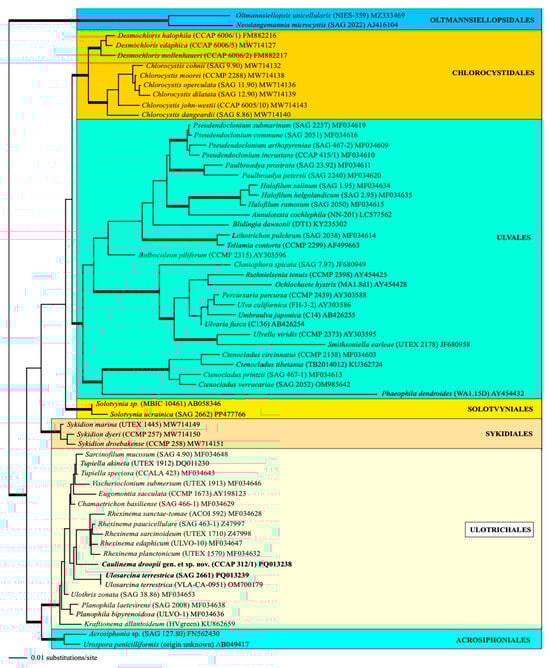 Molecular phylogeny of the Ulvophyceae s. str. based on SSU rDNA sequence comparisons. The phylogenetic tree shown was inferred using the maximum likelihood method based on a dataset of 1777 aligned positions of 64 taxa using PAUP 4.0a build169. For the analysis, the GTR + I + G (base frequencies: A 0.23431; C 0.22549; G 0.28486; U 0.25534; rate matrix A-C 1.2900; A-G 2.3030; A-U 1.3336; C-G 0.6993; C-U 4.2187; G-U 1.0000) with the proportion of invariable sites (I = 0.5543) and the gamma shape parameter (G = 0.4520) was chosen, which was calculated as the best model by the automated model selection tool implemented in PAUP. The branches in bold are highly supported in all analyses (Bayesian values >0.95 calculated with PHASE and MrBayes; bootstrap values >70% calculated with PAUP using maximum likelihood, neighbor joining, maximum parsimony, and RAxML using maximum likelihood). The sister group Oltmannsiellopsidales was chosen as an outgroup. The clade designations follow the currently accepted order classification of the Ulvophyceae []. The newly sequenced strains are highlighted in bold.