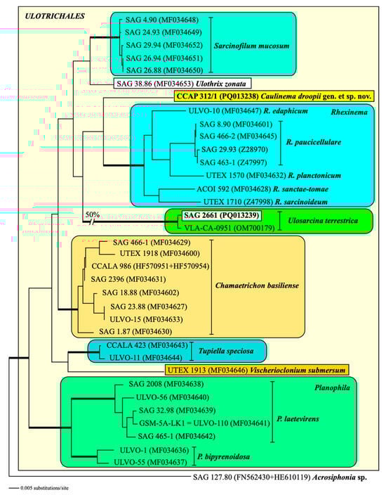 Phylogenetic analyses of the SSU rDNA sequences clearly revealed that both strains belong to the order Ulotrichales of the Ulvophyceae (Figure 3). The SSU rDNA of strain SAG 2661 is completely identical in sequence to the authentic strain of Ulosarcina terrestrica, which was originally described by Gontcharov et al. []. In contrast, the strain CCAP 312/1 represents an own lineage within the Ulotrichales, closely related to the genus Rhexinema. However, the resolution is weak, caused by the low genetic variability in the SSU rDNA within this order (<3% variability in uncorrected p-distances). The bootstrap and Bayesian support of all orders belonging to the Ulvophyceae is very high (>95% in all bootstrap analyses and >0.95 in all Bayesian analyses). For a higher resolution within the Ulotrichales, we used the concatenated dataset of SSU and ITS rDNA sequences. Compared with the SSU dataset used for Figure 3, this dataset is slightly reduced because of the lack of ITS rDNA sequences from Eugomontia and Kraftionema. Among the Ulotrichales, the analyses of this dataset showed nine lineages representing genera with high bootstrap and Bayesian support. Both newly sequenced strains, SAG 2661 and CCAP 312/1, represented Ulosarcina and a new genus, Caulinema (described below), respectively (Figure 4).