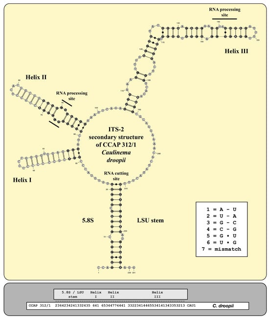 ITS-2 secondary structure and barcode of Caulinema droopii. The extraction of the conserved region (highlighted in black circles with white bases) and the translation into a number code for its usage as a barcode.