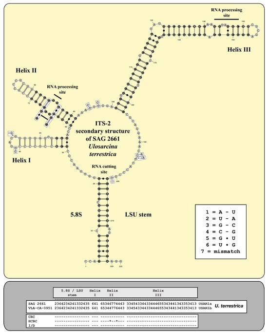 ITS-2 secondary structure and barcode of Ulosarcina terrestrica. The extraction of the conserved region (highlighted in black circles with white bases) and the translation into a number code for its usage as a barcode. The changes in SAG 2661 and the authentic strain of Ulosarcina terrestrica are highlighted in the white boxes.