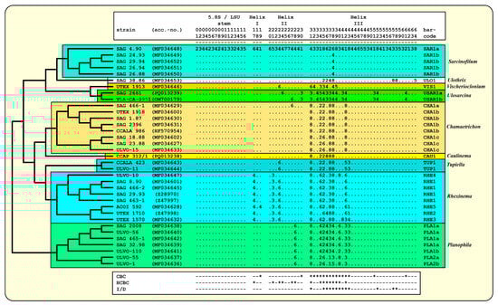 As already demonstrated for different lineages of the Ulvophyceae, Darienko and Pröschold [] and Darienko et al. [] used the ITS-2/CBC approach for species delimitation. For comparison, the ITS-2 secondary structures of the newly investigated strains were folded using the approach described by Darienko and Pröschold []. The ITS-2 secondary structures of the strains CCAP 312/1 and SAG 2661 are very conserved, as is typical for Ulvophyceae, and have three helices (Helix I-III sensu Mai and Coleman []); Helix IV is missing (Figure 5 and Figure 6). The conserved regions of ITS-2 highlighted in black circles in Figure 5 and Figure 6 were used as the barcodes, which were then translated into number codes. These numeric barcodes were then compared with all the ulotrichalean strains presented in Figure 4. This number alignment was analyzed using the neighbor-joining method implemented in PAUP to visualize the data as a tree. The resulting tree topology is presented in Figure 7, together with the number barcode for each strain. The nine genera and their species could be clearly distinguished by unique barcodes. Only the relationship among the genera differed from the tree presented in Figure 4. Among the Ulotrichales, 17 compensatory base changes (CBCs) and 15 HCBCs (one-sided CBCs) could be recognized (all marked with an asterisk in Figure 7). The genera with more than one species also showed CBCs between their species (Rhexinema—five species: seven CBCs, two HCBCs; Planophila—two species: four CBCs, four HCBCs). The ITS-2 barcode of CCAP 312/1 showed similarities to those of Chamaetrichon strains but differed in four positions from them. The ITS-2 of strain SAG 2661 showed few differences to the authentic strain of Ulosarcina terrestrica, as demonstrated in the white boxes in Figure 6. Comparing the ITS-2 barcodes of both strains, two HCBCs in Helix II could be discovered. Interestingly, both strains have identical SSU, ITS-1, and 5.8S rDNA sequences but differ in ITS-2, which is unusual. In contrast, different strains of the same species mostly showed genetic variability in ITS-1 but were similar in ITS-2, which can be seen for Chamaetrichon basiliense or Rhexinema paucicellulare.