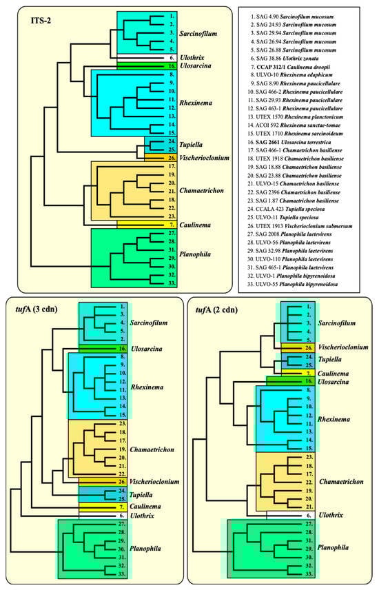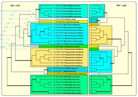 The elongation factor Tu (tufA) encoded in the chloroplast has been proposed as a barcode marker for green algae []. Therefore, we sequenced this gene of all the available strains presented in Figure 4, with the exception of the strains CCALA 986 Chamaetrichon basiliense and VLA-CA-0951 Ulosarcina terrestrica (both not available at present). To find out whether the tufA has the same discrimination power as ITS, we combined the tufA sequences with the SSU into one dataset and compared the phylogeny of this dataset with the SSU + ITS. The phylogenetic analyses of both datasets revealed similar tree topologies. All genera and species were clearly recognizable, and only the relationship among the genera differed (Figure 8).