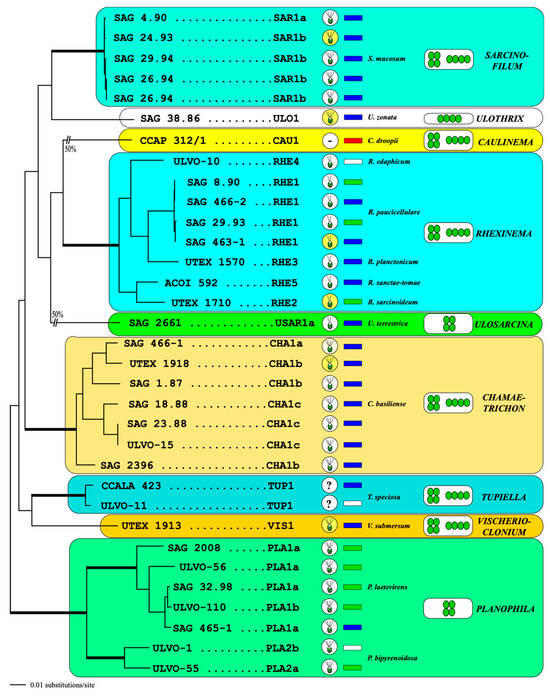 Phylogenetic analyses of several molecular markers (SSU, ITS, tufA) as well as plastomes and transcriptomes revealed the monophyly of the Ulotrichales sensu O’Kelly and Floyd with emendations [,,]. At present, the following genera belong to this order: Sarcinofilum Darienko & Pröschold; Tupiella Darienko & Pröschold; Chamaetrichon Tupa; Vischerioclonium Darienko & Pröschold; Rhexinema Geitler; Planophila Gerneck; Kraftionema Wetherbee & Verbruggen; Ulosarcina Gontcharov et al.; Eugomontia Kornmann; Gomontia Bornet & Flahault; Collinsiella Setchell & Gardner; Monostroma Thuret; Gayralia Vinogradova; and Ulothrix Kützing. The last three genera need to be revised because no cultures and sequences are available from the type species.