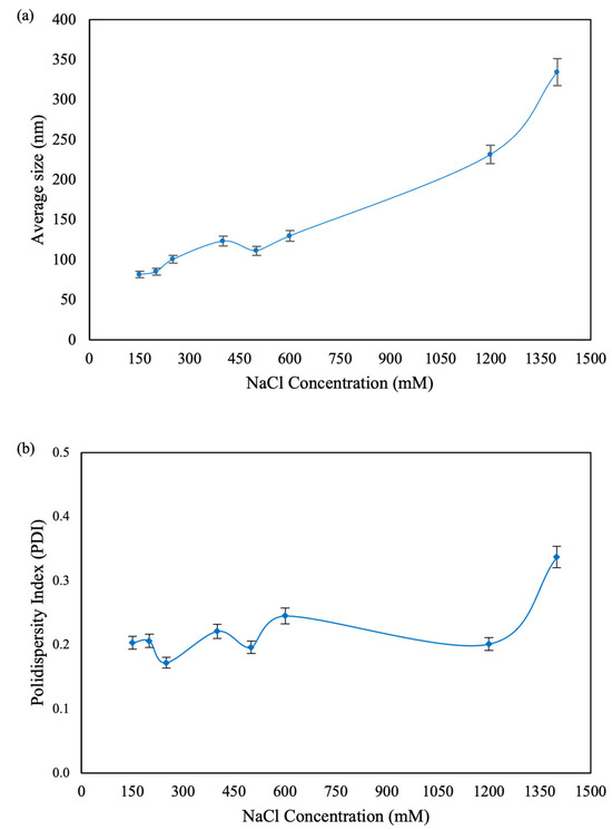 Average size and PDI values of CNPs obtained from DLS. (a) Effects of NaCl concentrations on the average hydrodynamic diameter. (b) PDI of prepared particles.