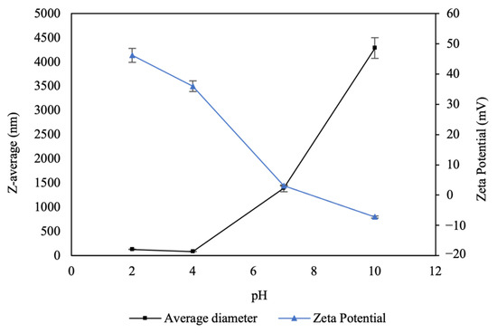 In response to increasing pH, the surface charges of the nanoparticles decreased, becoming nearly neutral at pH 7 and acquiring slightly negative charges under alkaline conditions (pH 10), with values ranging from 46.2 to −7.22 mV. Conversely, as pH increased, the sizes of the nanoparticles increased drastically with respect to the original size, reaching micrometer levels. This phenomenon could be attributed to the neutralization of the positive charges of the chitosan with the addition of NaOH, causing the formation of agglomerates.