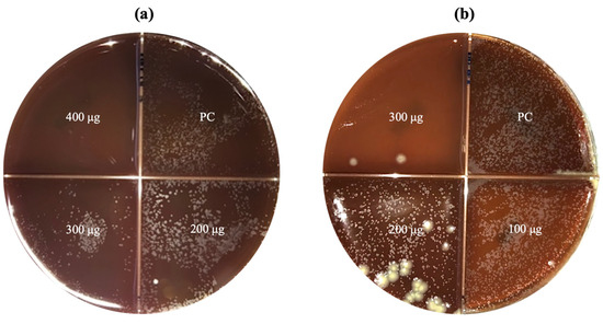 Susceptibility test using the agar proportion method in 5% blood agar against a clinical strain of Mycobacterium tuberculosis, where (a) CNP1400 (364.4 nm) completely inhibited growth at 400 μg concentration, and (b) CNP100 (116.6 nm) inhibited growth at 300 μg. PC (positive control) refers to the quadrant used as growth control.
