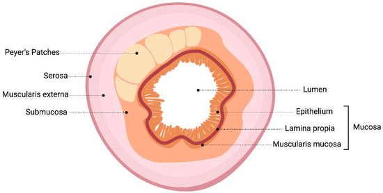 The different layers of the small intestine are depicted in Figure 2. The outermost layer of the intestine, the serosa, provides protection and minimizes friction. The muscularis externa, with its smooth muscle layers, drives peristaltic movements. The innermost layer, the mucosa, is critical for nutrient absorption, containing cells and glands that secrete digestive enzymes. Beneath the mucosa, the submucosa provides structural support and houses blood vessels and nerves [23]. The lumen within the mucosa is where alimentary content flows, allowing nutrient absorption and digestion. Together, these layers facilitate digestion and nutrient absorption and maintain the functional integrity of the gastrointestinal tract.