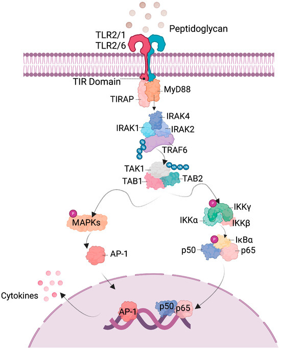 Following recognition by TLR2, the signaling cascade originates from the intracellular domain of TIR (Toll/IL-1 receptor), comprising three binding sites for adapter proteins MyD88 and TIRAP (adaptor protein containing TIR domain). Subsequently, the involvement of TRAF6 (TNF receptor-associated factor), another adapter protein, directs the activation of MAPK and NF-κB. The ensuing step involves the translocation of transcription factors like AP1 (Activating Protein 1) or the p50 and p65 subunits to the nucleus to convey signals for alterations in gene expression. These alterations may involve proteins or other molecular mediators like cytokines within the cascade. Depending on the specific stimulus, the response can be either inflammatory or anti-inflammatory [47,50]. TLR activation triggers an immune response executed by modifying the expression of transcription factors and producing inflammatory mediators. A simplified representation of the signaling pathways involved is depicted in Figure 4.