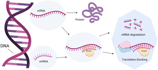 miRNAs are ncRNA molecules, generally 20–22 nucleotides in length, that play a crucial role in gene expression regulation. miRNAs bind to complementary sequences on messenger RNAs (mRNAs) and direct their degradation or inhibit their translation, thus modulating the protein produced from a specific gene (Figure 5). This post-transcriptional regulatory mechanism is fundamental for numerous biological processes, including development, cell differentiation, apoptosis, the cell cycle, and responses to immune challenges and stress. Its dysfunction is associated with multiple diseases, including cancer, cardiovascular diseases, neurological disorders, and inflammatory diseases [51]. Imbalances in the gut microbiota, primarily driven by gene expression patterns, are linked to gastrointestinal diseases and to conditions such as cancer, diabetes, cardiovascular diseases, obesity, and neurological developmental disorders [52].