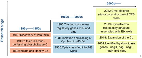 Clostridium perfringens, a Gram-positive bacillus, is ubiquitous in the environment as well as in the normal intestinal flora of humans and animals. C. perfringens, was first isolated and identified by William H. Welch in 1892 by necropsy (Figure 1), and is an intestinal conditionally pathogenic organism that becomes pathogenic when immunity is compromised, is an enteric conditionally pathogenic bacterium that becomes pathogenic when immunity is compromised. C. perfringens, with its rapid doubling speed and efficient resource utilization, coupled with its potent toxin production and environmental adaptability, can quickly colonize hosts and cause severe infections. These characteristics pose a serious threat to human health and global livestock (8–60% of susceptible animals are vulnerable to infection). Avian necrotizing enterocolitis causes a staggering global economic loss approximated at around 6 hundred million USD annually [1]. Antibiotic-associated diarrhea has been associated with a variety of bacterial infection factors, including C. perfringens, Clostridium difficile, Staphylococcus aureus, Candida albicans, and Klebsiella oxytoca [2]. Both C. perfringens and Clostridioides difficile can cause intestinal dysbiosis after antibiotic use. After the use of antibiotics such as β-lactams, β-lactamase inhibitors, and cephalosporins, C. perfringens produces enterotoxins, that cause antibiotic-associated diarrhea, in contrast, the use of antibiotics like fluoroquinolones, cephalosporins, and clindamycin, leads to Clostridioides difficile releasing toxins A and B, which also result in antibiotic-associated diarrhea [3]. New evidence suggests that antibiotic-associated diarrhea occurs in 5% to 30% of patients receiving antibiotics, with C. perfringens type A causing up to 15% of AAD cases and type F associated with 2% to 15% of AAD cases [3,4,5].