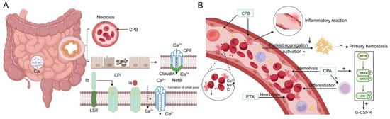 Unlike CPA, C. perfringens beta toxin (CPB) is a pore-forming toxin with a capsid, rim, and stem domain and produced by C. perfringens types B and C (Figure 4B) [55]. The CPB toxin disrupts the integrity of cell membranes by altering intracellular backbone proteins, signaling, and triggering inflammatory responses, among other pathways that lead to damage and inflammation in intestinal epithelial cells. Notably, endothelial cells and platelets are the target cells for CPB, and the CD31 protein, expressed explicitly on endothelial cells and platelets, functions as a CPB receptor (Figure 4A,B) [56,57]. CD31-deficient C57BL/6 mice demonstrated resistance to CPB [58]. CPB interaction with endothelial cells causes intestinal vascular necrosis and massive hemorrhage in the lamina propria and submucosa, primarily as small intestinal epithelial hemorrhage and necrosis [59]. CPB inhibits primary hemostasis by binding to the platelet plasma membrane, inhibits platelet aggregation, and impairs the ability of platelets to be activated by thrombin. (Figure 4A) [60]. Furthermore, the ability of CPB to bind to endothelial cells causes endothelial cell damage, increased vascular permeability and inflammatory response, localized tissue damage, as well as the exposure of subendothelial tissues and the initiation of endogenous coagulation, resulting in sustained bleeding from damaged vessels.