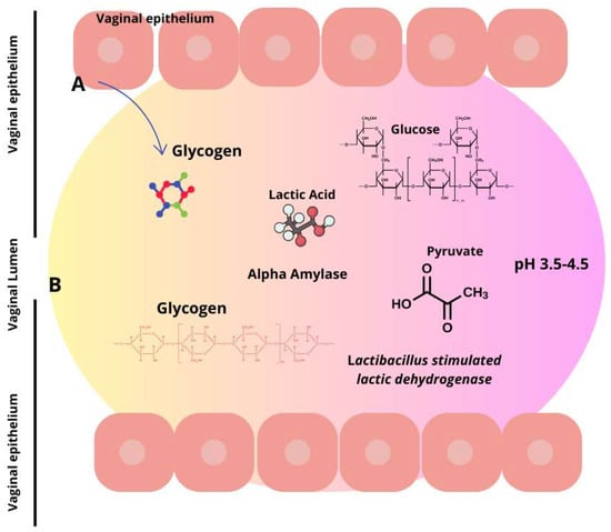 Lactic acid synthesis via glycogen breakdown in the vaginal environment. Lactic acid is produced by two distinct sources. Firstly, in the vaginal epithelium (A), L-lactate is produced, constituting 20% of the entire lactic acid, and secondly, from the microbiota (B), which contributes to the remaining 80% by metabolizing glycogen. Consequently, this produces the two isoforms of lactic acid wherein D-lactic acid is predominant.