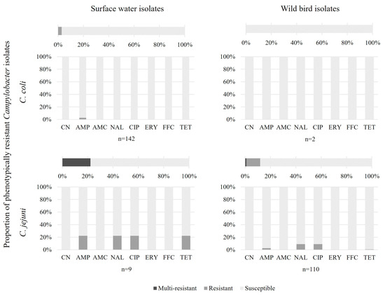 Proportion of phenotypically antibiotic-resistant Campylobacter isolates from surface waters and wild birds. CN, gentamycin; AMP, ampicillin; AMC, amoxicillin/clavulanic acid; NAL, nalidixic acid; CIP, ciprofloxacin; ERY, erythromycin; FFC, florfenicol; and TET, tetracycline.