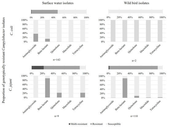 Proportion of genotypically antibiotic-resistant Campylobacter isolates from surface waters and wild birds.