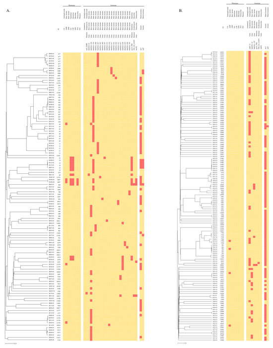 UPGMA dendrogram of cgMLST typing of C. jejuni (A) and C. coli (B) strains compiled with heatmap of AMR phenotype and genotype patterns. The red squares indicate the phenotypic resistance or the presence of AMR determinants. ST, Sequence Type.