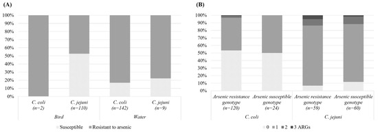 (A) Proportion of isolates from wild birds and surface waters possessing resistance gene(s) to arsenic and (B) proportion of susceptible Campylobacter isolates without ARGs and resistant isolates with one, two, or three ARGs in function of the resistance to arsenic.