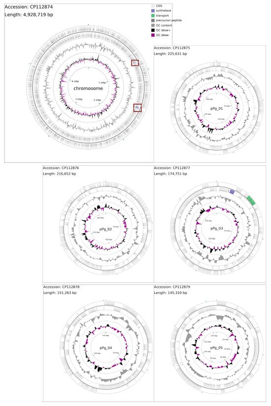 The genome of P. galeata CCNP1313 consists of six replicons, a circular chromosome of 4,928,719 bps, and five circular megaplasmids (Figure 1).