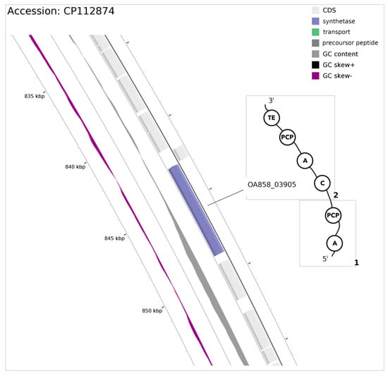 Closeup of chromosome region encoding NRPS synthetase in the reverse direction, within a range of 842,738-848,680 bp, marked blue. Circles represent domain organization within dipeptides producing nonribosomal synthetase. Domains are abbreviated as follows: A, adenylation; C, condensation; PCP, peptidyl carrier protein; TE, thioesterase. Domains in rectangles (1, 2 in bold) correspond to module numbering in Table 1.