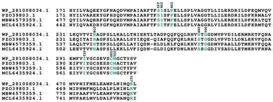 However, lysine within a strictly invariant C-terminal residue 517, which is responsible for binding with the carboxylate group and the ribose moiety of adenylate, remained unchanged. All amino acid positions accommodating a substrate in the first A module were found to be identical within three other cyanobacteria bearing similar synthases: PZO39803.1, MBW4579359.1, and MCL6435924.1 (Figure 3).