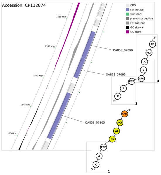 Closeup of the chromosome region encoding PKS/NRPS hybrid synthetase within a range of 1,530,477–1,548,363 bp encompassing three genes (marked blue) encoded on the reverse strand. Domains shown in circles are abbreviated as follows: A, adenylation; ACP, acyl carrier protein; C, condensation; KS, β-ketosynthase; AMT, aminotransferase; PCP, peptidyl carrier protein; TubC, N-terminal docking domain; TE, thioesterase. Colored domains represent the PKS fragment of synthetase. Domains in rectangles (1, 3, 4 in bold) correspond to the module numbering in Table 2.