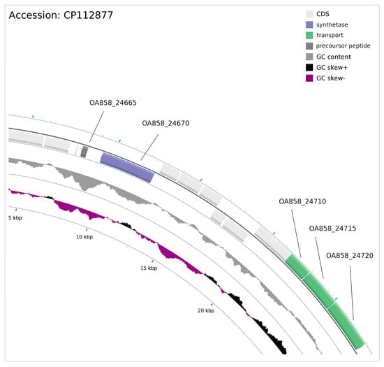 At the position placed 8991 bp downstream of the putative RiPP synthetase-encoding locus, three ORFs were found located on the forward strand, coding for proteins putatively responsible for secretion (OA858_24710) and ABC-type transport (OA858_24715, OA858_24720) of bacteriocins/lantibiotics. They all belong to a defined three-gene putative bacteriocin transport operon, whereas OA858_24715 contains a region encoding a six-transmembrane helical domain (6-TMD) of the ABC subunit of the bacteriocin system. More importantly, at the N-terminus of this protein, a peptidase domain was found that cleaves a double glycine (GG) motif-containing signal peptide from lantibiotic and non-lantibiotic bacteriocins before secretion [] (Figure 6).