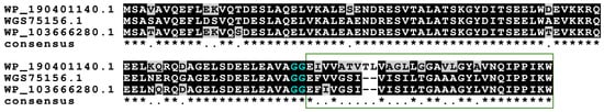 Alignment of RiPP precursor peptide (WGS75156.1) and two other precursors derived from Pseudanabaena strains. Downstream of the double glycine motif, a C-terminal core peptide is shown (marked by a green rectangle). Amino acids in gray indicate inconsistencies in sequence alignment. Asterisks indicate identical amino acid residues in all compared proteins.