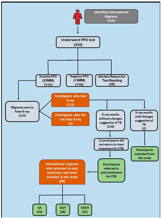 A total of 259 migrants were identified by the study team. During the initial screening stage for LTBI, all participants underwent tuberculin skin testing. Subsequently, 28 participants failed to return for test reading within the designated timeframe (48 to 72 h post application). Among the remaining 231 individuals who returned for test reading, 116 tested PPD-negative (<5 mm), while 115 tested positive for LTBI.