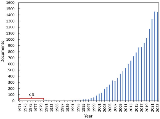 The exploration of the Scopus database commenced with an initial keyword search for “Persistent Organic Pollutants”, yielding a total of 15,393 papers (Figure 1). The observed exponential increase in documents addressing POP pollution since 1995 is likely due to a confluence of factors: growing awareness of the severe environmental and health risks posed by persistent organic pollutants, increased scientific research and regulatory efforts to understand and mitigate these pollutants, and the development of more sophisticated analytical techniques to detect and quantify POPs in various environmental matrices.