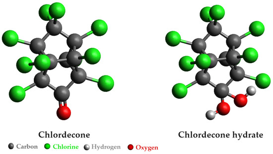 Various physical and chemical approaches have been employed to address the remediation of pesticides in water, with adsorption on activated carbon being a prevalent method. However, there has been a notable surge in interest in bioremediation techniques utilizing bacteria. Among the persistent organic pollutants drawing considerable attention from researchers is chlordecone, an organochlorine insecticide and fungicide extensively used from the 1960s to the 1990s and still prevalent in water and the food chain. Also known by the brand name Kepone, chlordecone poses significant health risks, acting as a reproductive and neurological toxicant, a carcinogen, and an endocrine-disrupting chemical. It forms bonds with liver proteins and plasma proteins, notably albumin and high-density lipoproteins [18]. The chlordecone molecule consists of a bishomocubane cage, ten chlorine atoms, and a ketone function. Notably, the ketone group undergoes spontaneous hydration, resulting in a stable gem-diol form recognized as chlordecone-hydrate (Figure 3). The distinctive structure of chlordecone imparts strong hydrophobic properties, fostering a robust affinity for organic matter. Additionally, this compound exhibits both acute and chronic toxicity, as highlighted by Della-Negra et al. [19].