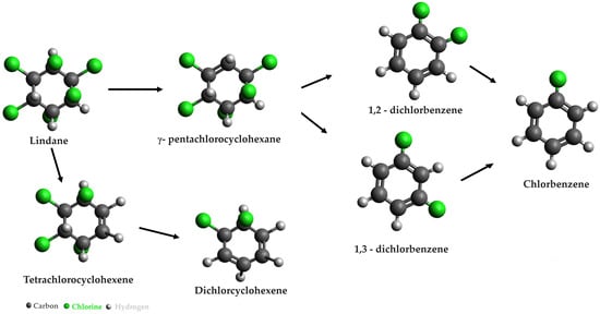 In the degradation experiments conducted by Barbance et al. [21], Citrobacter sp. 86 strains were employed for the breakdown of γ-hexachlorocyclohexane, commonly known as lindane. These experiments involved anoxic microbial incubations carried out in a glove box under daylight conditions. The monitoring of lindane degradation was conducted using gas chromatography–mass spectrometry coupled with headspace trap (HS-GC-MS) analysis. The anaerobic degradation pathways of lindane are illustrated in Figure 4 [22].