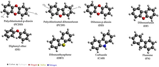 Polychlorinated dibenzo-p-dioxins (PCDDs) and polychlorinated dibenzofurans (PCDFs) are a highly toxic organic compounds, and they can persist in the environment for over a century. Among them, 2,3,7,8-TCDD (tetrachlorodioxin) stands out as the most toxic congener. While less-chlorinated and unchlorinated analogues are comparatively less toxic than 2,3,7,8-TCDD, they are still considered part of this dioxin group, alongside halogenated biphenyl ethers, carbazole, fluorine, and their carboxylated or substituted derivatives. Figure 5 illustrates the chemical structures of some chlorinated dioxins and related aromatic compounds.