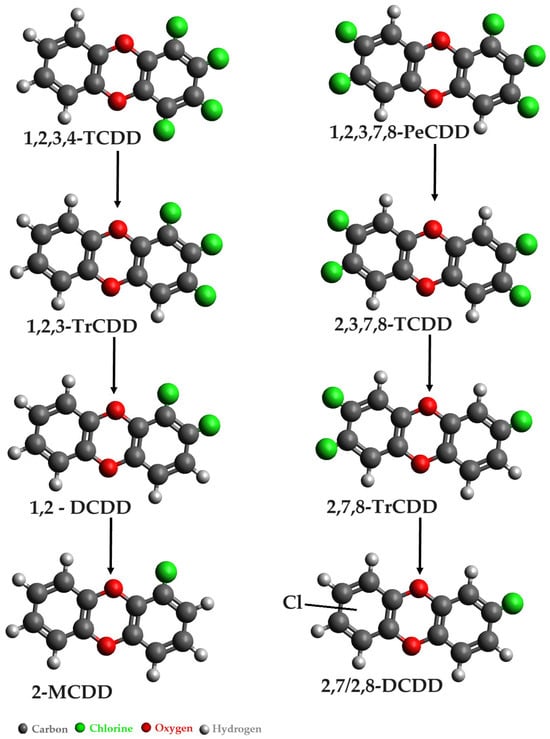 Bunge and Lechner’s study [33] revealed the reductive dechlorination capabilities of three anaerobic strains, specifically Dehalococcoides mccartyi strain 195, CBDB1, and DCMB5, in relation to polychlorinated dibenzo-p-dioxins (PCDDs). Notably, Dehalococcoides ethenogenes strain 195, known for its proficiency in dechlorinating tetrachloroethene to vinyl chloride and ethene, exhibited the ability to dechlorinate 1,2,3,4-TCDD and 1,2,3,4-TCDF [34,35].
