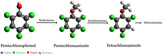 Numerous studies have explored the fungal degradation of halogenated hydrocarbons, with a focus on pentachlorophenol (PCP), intensively used as an insecticide, fungicide, herbicide, and wood preservative, and used in the chlorination of wastewater. In a study by Vacondio et al. [38], five fungal strains from the species Trichoderma sp., Aspergillus sp., Cladosporium sp., and Fusarium sp. were employed for the mycodegradation of PCP. Remarkably, Trichoderma harzianum CBMAI 1677 exhibited outstanding performance, completely degrading PCP within a week of incubation. Furthermore, this fungal strain demonstrated effectiveness in the biodegradation of penta- and tetra-chloroanisole. A likely PCP biodegradation mechanism by the strain Tricoderma harzianum is illustrated in Figure 7.