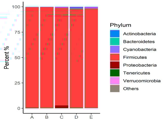 At the phylum level, seven were detected. However, we found that the abundance of Firmicutes prevailed among all groups (Figure 1). This result is expected since the microbiome composition analysis was performed on chickens at 42 days old, and the Firmicutes phylum can increase its abundance to 60–65% in the ileal microbiome throughout a chicken’s lifespan [33].