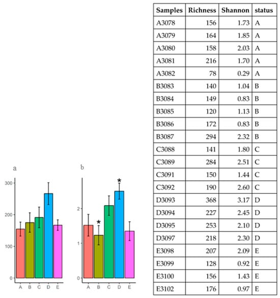 Diversity analysis of intestinal microbial profiles in broilers subjected to different diets. (a) Observed species richness or number of OTUs per sample; (b) Shannon diversity index. * Significant difference in the Shannon index (p = 0.02).