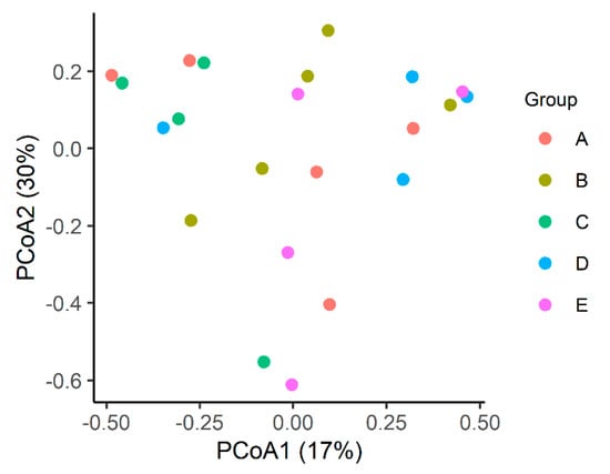 Alpha diversity was assessed and no significant differences in species richness was observed among the microbial profiles of the five groups. However, a significant difference in the Shannon index was found between group B (negative control) and group D (MCSP—basal diet with multiple colonizing strain probiotics) (p = 0.02) (Figure 3). For more details, refer to the table of all samples.
