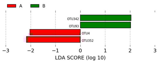 Meanwhile, Kaistobacter (OTU342) and Lactobacillus (OTU93) were the most significant OTUs in the microbiome of animals in group B (p < 0.05; LDA > 2), as observed in Figure 5. Kaistobacter has been associated with the suppression of bacterial diseases in plants [55]. Although microbial communities play important roles in disease suppression and the performance of broiler chickens, little is known about this interaction.