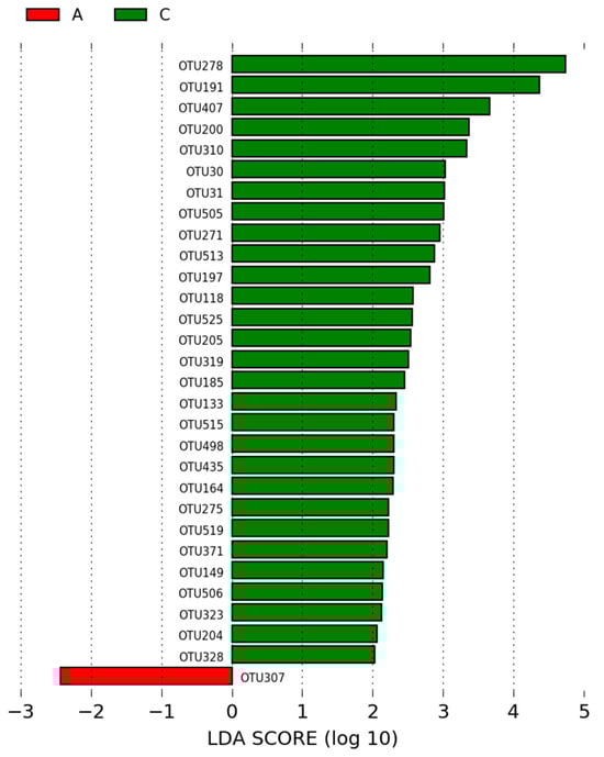 Of the OTUs identified in the intestinal microbiota of animals in the group A (positive control) and the group C (NAGF—basal diet + Normal Avian Gut Flora), 30 OTUs were statistically different between the two groups and had an LDA score > 2. The most significant OTU in the microbiota of animals in the positive control group was Moryella (OTU307). In group C, the most significant OTUs (based on LEfSe analysis) were Lactobacillus (OTU278, OTU191, and OTU407) and Facklamia (OTU200) (Figure 6).