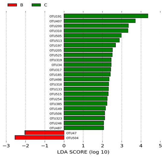 LEfSe analysis of OTUs showing phylum and the most specific classification of significant OTUs (LDA > 2) in groups B (negative control—basal diet without antibiotic and without probiotic) and C (NAGF—basal diet with Normal Avian Gut Flora).
